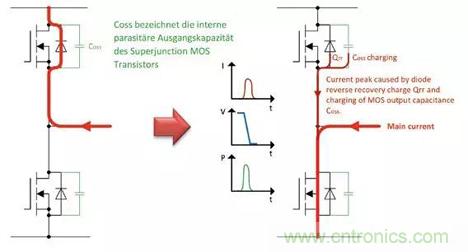 在導(dǎo)通期間,該電壓依賴性導(dǎo)致?lián)p耗誘導(dǎo)的充電電流的主要部分流過Q1的低VDS。然而,Q1兩端的低電壓意味著半橋?qū)ǖ牡投司w管有著高電壓導(dǎo)通。由于充電電流峰值,導(dǎo)致晶體管的導(dǎo)通損耗很高。