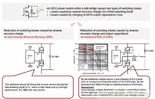 同步反向阻斷(SRB)串聯(lián)第二開關(guān)晶體管Q2以阻斷開關(guān)晶體管Q1的續(xù)流二極管中的反向電流。Q2的激活與Q1同步。反向電流通過并聯(lián)的碳化硅(SiC)肖特基二極管,該二極管具有高擊穿電壓和極低的反向恢復(fù)電荷,這大大降低了Qrr對開關(guān)損耗的影響。Q2的續(xù)流二極管的極性確保晶體管不能產(chǎn)生高電壓,因此,低介電強(qiáng)度(60 V)的型款就足夠了。