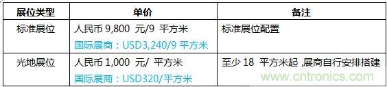 標準展位配置包括:展位租金、展位搭建拆除費用、展位地毯鋪設、中英文楣板字、咨詢桌一張、洽談桌一張、折椅兩把、紙簍一個、射燈兩盞、220V 插座一個、會刊登錄、參展商證件。