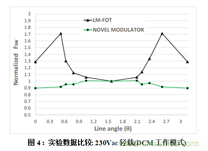 具體地講,圖3所示是開關(guān)頻率在寬輸入電壓(230Vac-左和115Vac-右)范圍和所有負(fù)載條件中(CCM-左, DCM - 右)保持恒定。與標(biāo)準(zhǔn)LM-FOT方法相比,本文提出的創(chuàng)新調(diào)制器的性能大幅改進(jìn),特別是在高壓線DCM運(yùn)行模式更為明顯,如圖4所示。