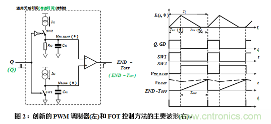 本文介紹一種創(chuàng)新的自適應(yīng)穩(wěn)壓器(AC/DC或DC/DC)脈寬調(diào)制器(PWM),基于“固定關(guān)斷時(shí)間(FOT)”或“恒定導(dǎo)通時(shí)間(COT)”控制方法,可以在全工況下(例如,滿負(fù)載CCM或中低負(fù)載DCM模式,寬輸入輸出電壓)以恒定開關(guān)頻率工作,無轉(zhuǎn)換器的寄生參數(shù)(例如,功率開關(guān)和濾波電感器的電阻)的負(fù)面影響。此外,本文提出的調(diào)制器電路與轉(zhuǎn)換器拓?fù)錈o關(guān)(升壓、降壓、反激式等),只與功率開關(guān)管柵極驅(qū)動(dòng)邏輯信號(hào)(GD)有關(guān),節(jié)省芯片引腳數(shù)量,且/或降低設(shè)計(jì)復(fù)雜程度。