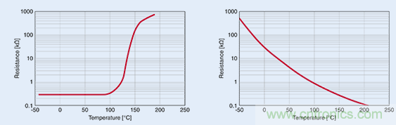 在超出某一特定溫度時(shí),正溫度系數(shù) (PTC) 熱敏電阻(左圖)的電阻出現(xiàn)急劇升高,故而適合用作溫度限值傳感器。而負(fù)溫度系數(shù) (NTC) 熱敏電阻的電阻則呈線性關(guān)系,故而適用于溫度測量。