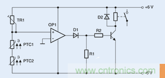 切換原理:記錄溫度限值圖3顯示為由兩個(gè)串聯(lián)正溫度系數(shù) (PTC) 傳感器組成的一個(gè)簡單電路,。TR1與兩個(gè)正溫度系數(shù) (PTC) 傳感器組成一個(gè)分壓器,該分壓器能夠提供運(yùn)算放大器的非反相輸入,而運(yùn)算放大器則充當(dāng)比較器的角色。