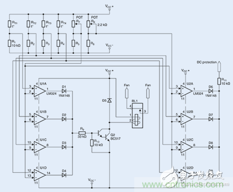 2個(gè)開關(guān)閾值的參考值將通過2個(gè)微調(diào)器,即R7和R8(分別為2.2 k?)進(jìn)行設(shè)置。如上所述,兩個(gè)微調(diào)器將分別產(chǎn)生900?或550?的電阻。至于8個(gè)所需的比較器(U1A-U1D以及U2A-U2D),則采用經(jīng)濟(jì)型LM324放大器。在滿負(fù)荷跳線模式下進(jìn)行的一個(gè)持續(xù)數(shù)小時(shí)的測試表明,風(fēng)扇能夠在85℃時(shí)可靠地進(jìn)行開啟。由于系統(tǒng)具有相對(duì)較低的熱量期限,故而無需采用常用的滯回比較器電路。