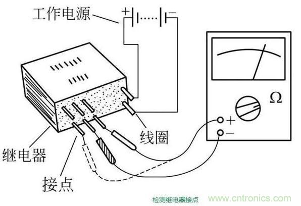 給繼電器線圈接上規定的工作電壓,用萬用表“Rx1K”檔,檢測節點的通斷情況。