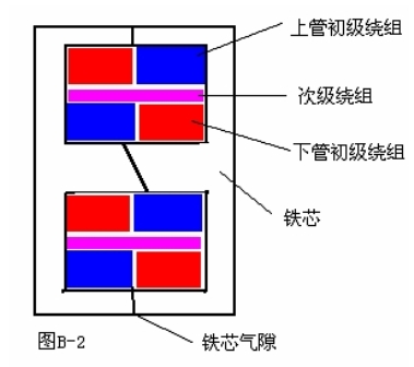 最后說(shuō)一說(shuō)繞組線圈的結(jié)構(gòu),因?yàn)槟憴C(jī)的后級(jí)都是用對(duì)管組成推挽電路的,為了防止由于兩管負(fù)載不平衡所引鐵芯起直流磁化,上下管的負(fù)載繞組不僅要做到電感一致,并且直流電阻也要一致,另外為了較少線間分布電容,在繞法上采取分層分邊的繞法,如圖B-2是音頻輸出變壓器繞組的結(jié)構(gòu)剖面圖。這種繞組結(jié)構(gòu)可使上下輸出管的總電抗保持一致,從減少線間的分布電容的角度來(lái)看,層分得越多越細(xì)越好,從而使輸出信號(hào)的頻響特性得到較好的改善。