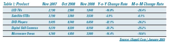 2008年11月,許多主要消費(fèi)電子產(chǎn)品的出口量環(huán)比和同比雙雙下降,包括液晶電視、衛(wèi)星機(jī)頂盒(STB)、DVD機(jī)、數(shù)碼相機(jī)和微波爐。數(shù)碼相機(jī)出口量的同比下降幅度最大,比2007年11月減少33.7%。液晶電視環(huán)比降幅最大,單位出貨量比10月下滑26.4%。