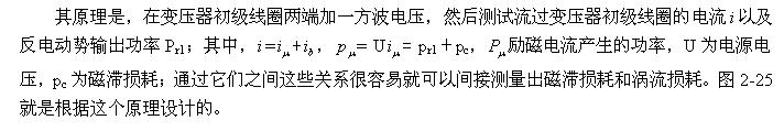 另外,工作于反激式輸出的大功率單激式開關電源變壓器,其初級線圈的電感相對比較小,因此,其勵磁電流比較大,要精確測試其磁滯損耗和渦流損耗也是比較困難的。因為,如果按實際工作的條件來測試,反電動勢輸出的功率非常大,因此,在負載R1上損耗的功率也將很大;如果用小功率進行測試,離實際工作條件相差太遠,測量出來的結果就沒有實際意義。