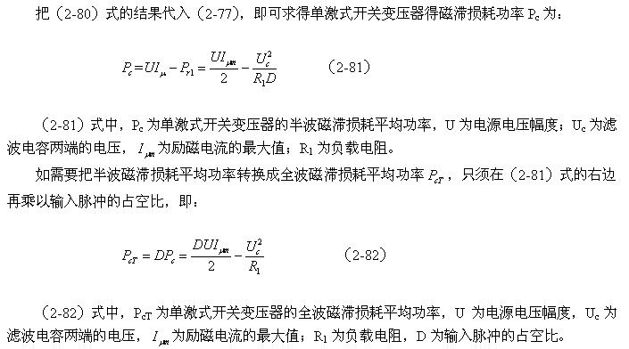 從(2-81)式和(2-82)式還很難看出,單激式開關電源變壓器的磁滯損耗主要與誰相關,因為等式右邊的減數和被減數與輸入電壓、脈沖寬度都有相同變化的趨向。實際上在脈沖寬度固定的情況下,單激式開關電源變壓器的磁滯損耗是很小的,此結果在《開關電源變壓器磁滯損耗分析》的章節中已經分析過。