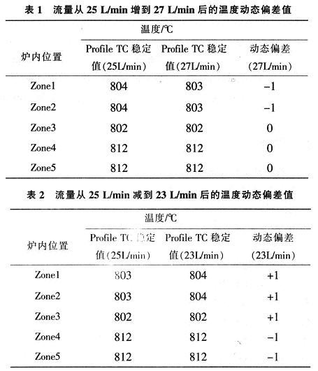 (4)手動調節大N2流量,從25L/min,減少到23L/min,記錄流量調節前后穩定溫度值和流量變化導致的溫度動態偏差值,見表2,表中Zone1為爐尾,Zone2是爐中尾,Zone3為爐中,Zone4是爐中口,Zone5為爐口。