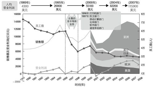 TI公司從上世紀(jì)90年代以來就進(jìn)行了結(jié)構(gòu)改革,在集中式經(jīng)營方面為眾多廠商做出了榜樣。TI公司原先經(jīng)營的業(yè)務(wù)非常廣泛,不僅涉及半導(dǎo)體業(yè)務(wù),還有非半導(dǎo)體業(yè)務(wù)(見圖l)。公司在1995年前后做出了專注于DSP和模擬電路的決策,經(jīng)過短短3年時(shí)間便完成了這一巨大轉(zhuǎn)變。1996年賣掉了打印機(jī)部門,l997年又相繼賣掉了防衛(wèi)部門、移動(dòng)計(jì)算部門、化學(xué)部門、軟件部門和通信 系統(tǒng)部門。與此同時(shí),公司投入大量資金通過企業(yè)并購等方式,提高了DSP的設(shè)計(jì)能力,獲得了DSP相關(guān)的軟件技術(shù)和通信技術(shù)。為擴(kuò)大模擬業(yè)務(wù),公司也花費(fèi)巨資獲得了電源 /放大器技術(shù)。
