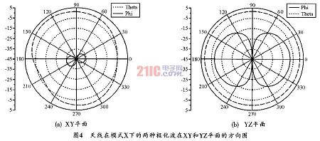 從圖3可以看出,射頻電流主要集中在天線水平方向的微帶線上(這印證了前面的分析)。但同時,在中間部分的微帶以及天線其他部分也存在射頻電流,因此,天線仍會輻射部分垂直極化波。圖4所示為天線的兩種極化波在XY及YZ平面的方向圖。