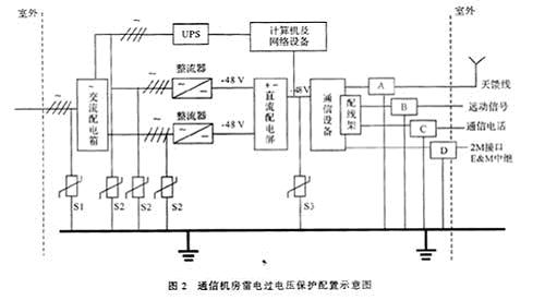 圖為我局通信機(jī)房雷電過電壓保護(hù)配置示意圖,其中S1為DEHNventil 280/4型電源1、2級(jí)復(fù)合防雷器,S2為DEHNguard T385型電源2級(jí)防雷器,S3為DEHNrail 48FML型電源3級(jí)防雷器(直流48 V),A為UGK/N(2.5 G)天饋線防雷器,B為YG20-A音頻隔離變壓器,C為ZH型中和變壓器,D為同軸防雷器。