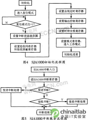 在CAN總線端,單片機控制著傳輸流程。SJA1000的初始化由單片機完成,其初始化流程圖見圖4所示,在正常工作模式下,單片機可控制SJA1000的收發等操作,以完成和CAN總線的通信。當主機端傳來數據時,單片機將數據轉發到SJA1000的發送緩沖區,并由SJA1000根據CAN協議自動封裝后發送到CAN總線上;當SJA1000接收到來自CAN總線上的一個有效的報文后,系統將在INT引腳上產生一個硬件中斷信號(低有效),當單片機收到中斷信號后,即進人中斷服務程序,以完成數據的接收和處理,其中斷服務流程見圖5所示。
