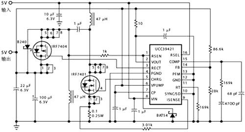 如果USB外設需要5V電源,事情就稍為有些棘手,因為USB口的外供電壓可能略高于也可能略低于這一數(shù)值。為此,以往常用先升壓再降壓或先降壓再升壓的辦法。這在需要多種輸出電壓的場合,倒也不失為一條可行途徑;但若僅需單一的5V輸出,此類電路結構便難免“疊床架屋”之嫌。或許正是這一緣故,上述之SEPIC盡管電路復雜,成本也高,但因其能集升壓、降壓功能于一身,所以近來已呈應用漸廣之勢。