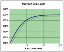 如果R1和R2的阻值不同,那么電壓輸出的誤差將逼近固有的電阻容差的兩倍,如圖3所示。分壓器設(shè)計的最壞情況出現(xiàn)在兩個電阻的容差正好相反時。如果分壓器的設(shè)計采用了容差為±0.1%的電阻,那么在此比率下輸出誤差最壞可達(dá)±0.2%。