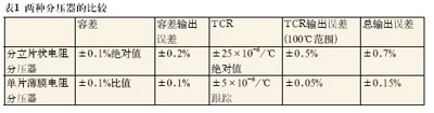 表1匯總了這兩種方法。使用0.1%的分立電阻設(shè)計分壓器時,由容差和TCR引入的最大輸出誤差是0.7%。使用高精度薄膜電阻時的最大輸出誤差是±0.15%——性能方面超過4倍的改善。