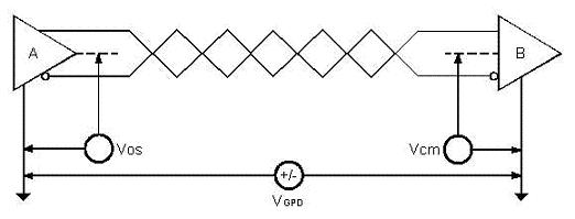 如圖1所示,當發送器A向接收器B發送數據時,發送器A的輸出共模電壓為VOS,由于兩個系統具有各自獨立的接地系統存在著地電位差VGPD,那么接收器輸入端的共模電壓就會達到VCM=VOS+VGPD。RS-485標準規定VOS≤3V,但VGPD可能會有很大幅度(十幾伏甚至數十伏),并可能伴有強干擾信號致使接收器共模輸入VCM超出正常圍,在信號線上產生干擾電流輕則影響正常通信,重則損壞設備。