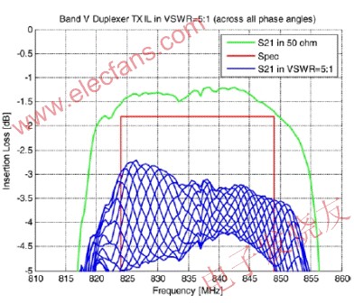 當天線端口處在失配狀態時,RF性能迅速下降。特別需要指出的是,如果天線處在VSWR=3:1(多波段天線的常用設計指標)的狀態,大約1.25dB的功率由于反射而立即損失;如果VSWR達到5:1,失配損耗將提高到2.55dB。這樣的失配也將使功率放大器(PA)輸出功率下降,進一步減少了輻射功率。如果手機的窄帶雙工或接收濾波器沒有端接到其特征阻抗,在其通帶中還會出現紋波,并額外帶來高達2dB的損失。在圖3中,綠線代表典型的WCDMA雙工發射濾波器在阻抗為50Ω時的性能。紅線是標準指標,藍線顯示當天線在所有相位VSWR均為5:1時的濾波器響應;注意在最壞情況下插入損耗達5dB。