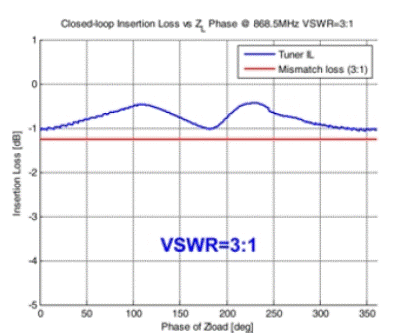 失配傳感器把VSWR(反射回天線的功率幅度)與發射功率進行比較并調節阻抗調諧電路。調諧算法使可調元件在各種使用情況下持續跟蹤環境條件,并把阻抗調到最優值(見圖1)。