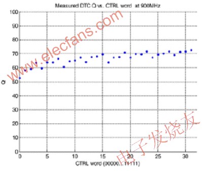 圖7:DuNEDTC器件的品質因數實測結果,在900MHz時其Q值為60-70。