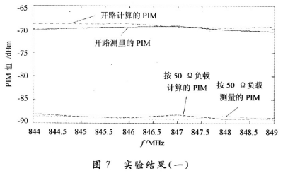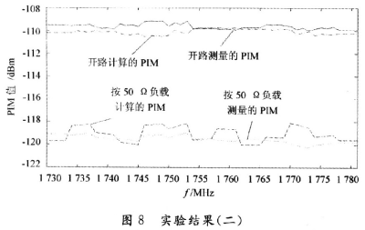 由以上的分析可知,這種計(jì)算方法計(jì)算出來的PIM值和真實(shí)的PIM值十分接近,并且隨頻率的變化趨勢一致。同時(shí)可以看出,在開路的時(shí)候所測量的 PIM明顯要比接負(fù)載的時(shí)候所測量的PIM要大,增大的PIM值是因?yàn)槠ヅ洳缓盟斐?,?dāng)然,相同的負(fù)載狀況在不同的頻率下呈現(xiàn)的匹配狀態(tài)是不一樣的。