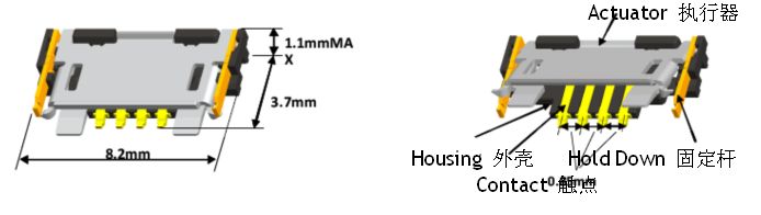 該連接器為0.2毫米(錯位排列)連接間距,帶有0.4毫米導向位。目前可提供11針和29針,計劃最多達81針。連接器高度為0.9+/-毫米。其外殼材料為熱塑塑料(UL 94V-0), 固定調整片和連接器的銅合金無鹵素。作為底部接觸型產品,因此可最為廣泛地適用于掀蓋式執行器,很方便進行關門操作。就連接器規格而言,連接器可通過帶有外殼開槽結構的耳式電纜分割結構提供電纜預持功能。要求的電纜厚度是:0.2毫米+/-0.03