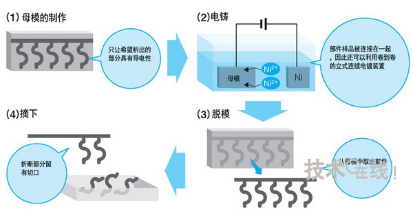 此外,電鑄在生產上也具有優勢。沖壓加工需要昂貴且生產周期較長的模具,而電鑄則不需要。歐姆龍表示,“采用沖壓加工的話,模具制作需要一個月左右的時間。而電鑄只需約一周時間就可以進入量產”。不過,由于電鑄并不是一項新技術,因此其他公司很容易效仿。關于這一點,歐姆龍表示“即使生產出試制品,也不容易進行量產”。歐姆龍沒有公布具體的量產方式,不過根據部件樣品構想的大致生產流程如圖3所示。(記者:池松 由香)