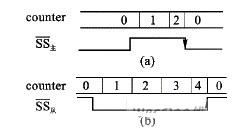 對(duì)從模式(MSTR=0),在沒有數(shù)據(jù)傳送的時(shí)候,SS高電平表示從器件未被選中,從器件不工作,MISO輸出高阻;在數(shù)據(jù)傳輸過程中,片選信號(hào)SS必須接低電平,且SS不允許跳變。如果SS從低電平跳到高電平,在SS的上跳沿,SPI模塊也將檢測(cè)到模式錯(cuò)誤,清空內(nèi)部計(jì)數(shù)器counter,并結(jié)束正在進(jìn)行的數(shù)據(jù)傳輸。直到SS恢復(fù)為低電平,重新使SPEN=1時(shí),才重新開始工作,如圖6(b)所示。