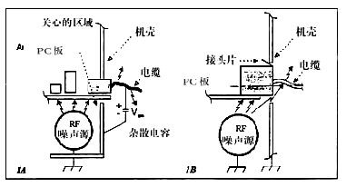 使共模電流注入到I/O區的另一機理,是附近有強的干擾源的耦合。甚至有些“屏蔽”連接器也無用,因為干擾源就在連接器附近,如PC機環境。如果在連接器和底板之間有一個缺口,此處所感應的RF電壓可以使EMC性能下降(圖1B)。