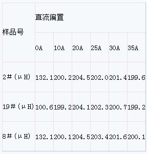 將表1所測試的電感插入恒磁片后,再加工成成品電感,取三個成品作測試樣品,測試其直流特性如表2所示(測試儀表為HP4284A,測試頻率為1kHz):