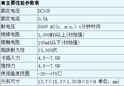 “CIM-J38N”連接器采用了小型、薄型設(shè)計,標(biāo)準(zhǔn)安裝型的物理尺寸為高1.30mm、寬13.7mm、進深15.3mm。連接器采用Push-in Push-out推擋方式,卡排出尺寸為3.8mm。同時還附帶防卡彈出止動結(jié)構(gòu)、裝載卡檢測開關(guān)(Normally open型)、RFID接頭,并增強了卡反向插入功能。另外還增強了EMI對策用接地線(Ground)功能。