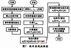 筆者設(shè)計(jì)了一臺1kVA的逆變電焊電源實(shí)驗(yàn)樣機(jī),其系統(tǒng)的核心控制器是TI的DSP芯片TMS320LF2407A。TMS320LF2407A是一款高性能16位數(shù)字信號處理器,是TI公司定點(diǎn)DSP2000系列中的一員,它是專門為控制與運(yùn)動(dòng)控制的數(shù)字化實(shí)現(xiàn)而設(shè)計(jì)的。該DSP可完成逆變器輸出電壓頻率的控制、負(fù)載電壓和電流取樣、開關(guān)管的導(dǎo)通關(guān)斷時(shí)間控制等。其軟件實(shí)現(xiàn)流程圖如圖7所示。