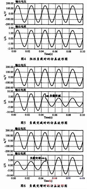 圖4給出了在輸入電壓為200V,額定負(fù)載分別為ZL=100Ω時(shí)的輸出電壓和輸出電流仿真波形;由圖4可見,輸出電壓頻率均能穩(wěn)定在50H z;圖5所示為負(fù)載突減時(shí)的仿真波形,其中突變部分是負(fù)載ZL=20Ω切換到ZL=40Ω時(shí)的輸出電壓、電流仿真波形;圖6為負(fù)載突增時(shí)的仿真波形,其中突變部分是負(fù)載ZL=40Ω切換到ZL=20Ω時(shí)的輸出電壓、電流仿真波形;通過以上仿真波形圖可知,該系統(tǒng)工作穩(wěn)定,靜態(tài)誤差小,并具有很強(qiáng)的魯棒型,同時(shí),這種電流內(nèi)環(huán)電壓外環(huán)的雙閉環(huán)控制的動(dòng)態(tài)響應(yīng)速度非常快,因此可見,用該方法對該系統(tǒng)控制電路進(jìn)行設(shè)計(jì)是有效而可行的。