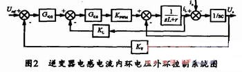 本文的雙閉環(huán)控制結(jié)構(gòu)由外環(huán)電壓調(diào)節(jié)器和內(nèi)環(huán)電流調(diào)節(jié)器組成。其中外環(huán)電壓調(diào)節(jié)器Gv(s)一般采用比例一積分(PI)調(diào)節(jié)器,內(nèi)環(huán)電流調(diào)節(jié)器Gi(s)可以采用比例(P)調(diào)節(jié)器。圖2所示是逆變器電感電流內(nèi)環(huán)電壓外環(huán)控制系統(tǒng)的結(jié)構(gòu)框圖。
