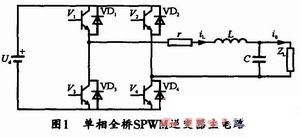 圖1所示為單相全橋逆變電源的主電路原理圖。圖中,Ud是逆變橋直流輸入電壓。L是輸出濾波電感,C是輸出濾波電容,r是輸出電感、死區(qū)效應(yīng)以及濾波電容的等效電阻。