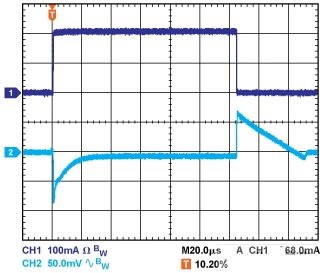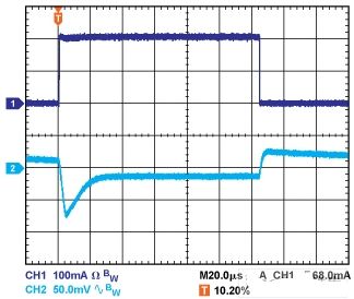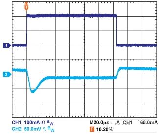 輸出電容還會影響調節(jié)器對負載電流變化的響應。控制環(huán)路的大信號帶寬有限,因此輸出電容必須提供快速瞬變所需的大多數(shù)負載電流。當負載電流以500 mA/ μs的速率從1 mA變?yōu)?00 mA時,1 μF電容無法提供足夠的電流,因而產生大約80 mV的負載瞬態(tài),如圖1所示。當電容增加到10 μF時,負載瞬態(tài)會降至約70 mV,如圖2所示。當輸出電容再次增加并達到20 μF時,調節(jié)器控制環(huán)路可進行跟蹤,主動降低負載瞬態(tài),如圖3所示。這些示例都采用線性調節(jié)器ADP151,其輸入和輸出電壓分別為5 V和3.3 V。