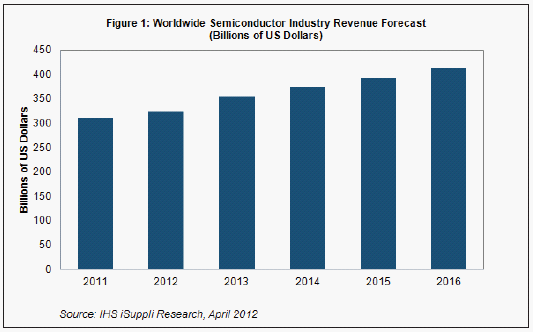 預(yù)計2012年半導(dǎo)體營業(yè)收入將達(dá)到3246億美元,比去年的3114億美元增長4%。與去年1%的增長率相比,今年增長情況有所改善,而且所有信號都顯示,隨著全球經(jīng)濟趨于穩(wěn)定,半導(dǎo)體產(chǎn)業(yè)將重新站穩(wěn)腳跟。除非全球市場出現(xiàn)意外的經(jīng)濟下滑或者半導(dǎo)體產(chǎn)業(yè)出現(xiàn)重大失策,否則營業(yè)收入未來幾年將繼續(xù)上升,到2016年將達(dá)到4128億美元左右,如圖1所示。