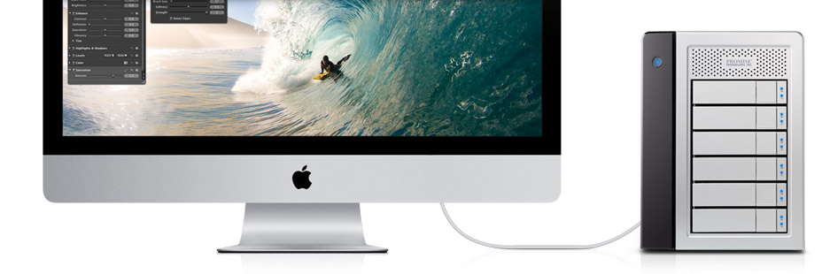 借助 Thunderbolt,你可以將 MacBook Pro 或 iMac 打造成專業的視頻處理設備,它們就像你的 Mac Pro。如果你是一個視頻剪輯師,想像一下你可以使用一個端口,就可以連接高性能的存儲設備,高分辨率顯示器,和高比特率的視頻采集設備,完成影片全部的后期制作。Thunderbolt I/O 傳輸技術可讓你串接多達 6 部全新外設,比如:Promise Pegasus RAID 或 LaCie Little Big Disk1,你甚至可以在串聯的末端添加一臺 Apple LED Cinema Display。