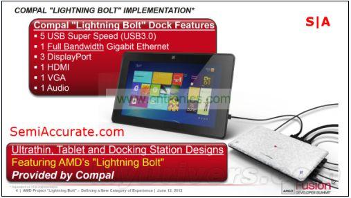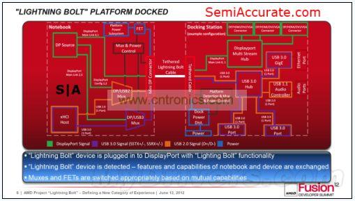 從硬件層面上看,Lightning Bolt其實(shí)很簡單,驅(qū)動(dòng)級(jí)的硬件兼容性使得芯片上的USB通道及APU上的DP通道用一條線纜就可以連接起來并輸出到hub上。