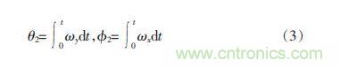 若使用陀螺儀來測量平衡車姿態角度,設陀螺儀測量載體相對慣性坐標系的x、y、z 三軸旋轉角速度分別為ωx、ωy、 ωz。并定義0 時刻平衡車直立靜止。可得到俯仰角θ2和橫滾角φ2估計值與ωx、ωy之間的關系如式3 所示: