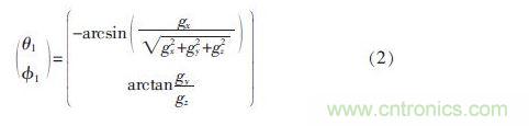 其中,Cbn為慣性坐標系到載體坐標系的變換矩陣;θ 為俯仰角;φ為橫滾角;g 為重力加速度; 可以通過測量重力加速度分量gx、gy、gz,計算出平衡車俯仰角θ1和橫滾角φ1估計值