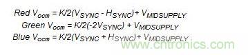 AD8147根據以下公式提供額外的特性,以編碼TTL邏輯電平、三路輸出共模電壓(VOCM)上的水平和垂直同步脈沖信號: