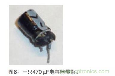 接著我用儀表檢測輸出電壓。在繼續閱讀下文之前,請回頭看一下圖2。你是否注意到最左邊那個緊鄰USB連接器的470μF電容器?我的手指擦過這個電容器,覺得很燙。然后我聽到呼的一聲,發現電容器爆裂開來,封裝的底端飛彈出去,見圖6。