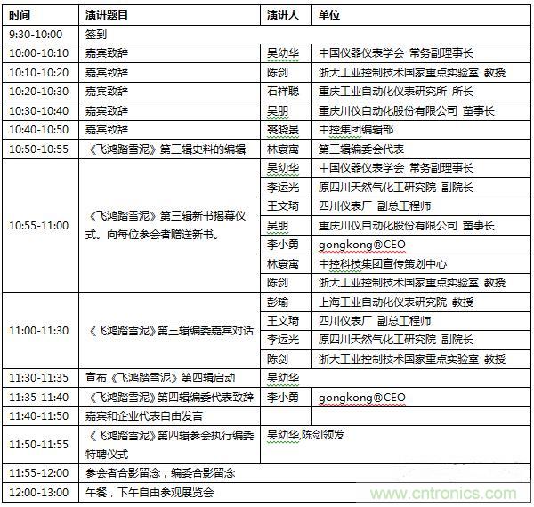 中國儀器儀表學會常務副理事長吳幼華,浙大工業控制技術國家重點實驗室陳劍教授,重慶工業自動化儀表研究所石祥聰所長,重慶川儀自動化股份有限公司總經理吳朋,中控集團編輯部裘曉景將分別發表致辭,闡述中國儀表和自動化的發展與現狀。林寰寓將代表第三輯編委會與大家分享《飛鴻踏雪泥》第三輯史料編輯的心路歷程,gongkong®CEO李小勇將與吳幼華、李運光、王文琦等專家一起參加《飛鴻踏雪泥》第三輯新書揭幕儀式及嘉賓對話環節。李小勇先生還將代表《飛鴻踏雪泥》第四輯編委,發表致辭,預祝第四輯出版成功!
