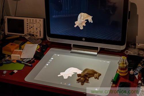 屏幕支架上方的是包含掃描儀相機的投影儀,允許在 Touch Mat 上盡可能直觀的使用。盡管 Touch Mit 本身并非觸控屏幕,但通過這些設備的交互能夠投影圖片并進行相應的觸控交互。Sprout Pro 正面裝備了支持 3D 眼鏡的 23.6 英寸 Zvr顯示器,同時支持虛擬現實和增強現實。