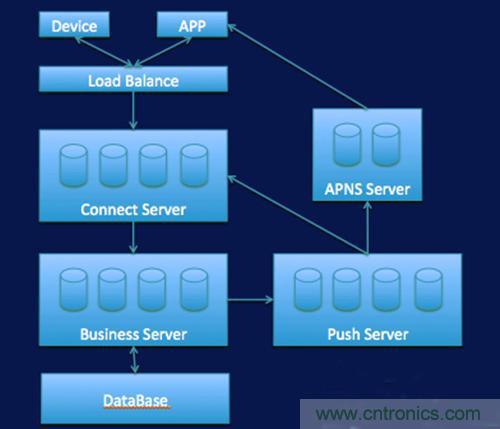 看一下最簡單的IM架構,這里面要保持長連接,接下來做一些業(yè)務處理,下面是存儲,如果App要去控制Device的時候,發(fā)到業(yè)務層處理完了之后,這里面有一個推送的,可以找到Device到底連了哪一臺機,然后再把數據推送過來。如果Device自己的狀態(tài)發(fā)生變化,它的數據要推送給APP,基本上是這樣的工作流。如果App是黑莓等設備的,我們可能要專門推送到APNS里面來。