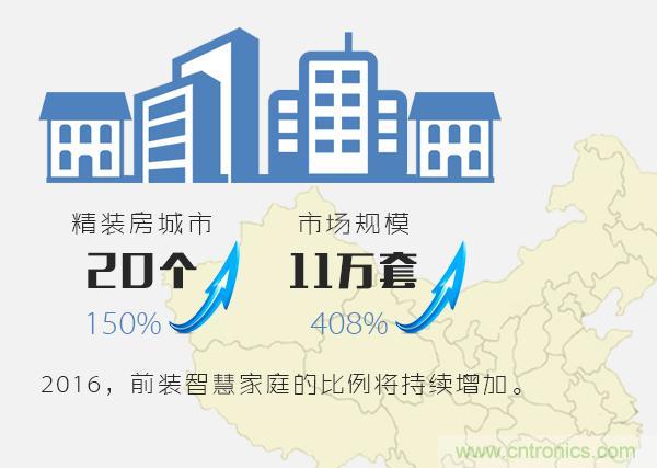 2015年各大地產商和物業公司都在推出智慧家庭和智慧社區的產品或樣板,包括花樣年、招商地產、金地物業、保利地產、萬科等。據奧維數據顯示,2015年有智能精裝房的城市達到20個,同比增長150%;市場規模達到11萬套,同比增長408%。2016年面對低迷的樓市,為了維持房價,商品房中前裝智慧家庭的比例還會增加。