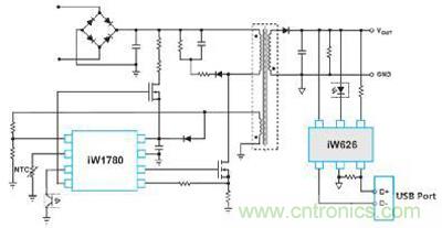 典型的手機充電器的硬件結(jié)構(gòu)(以基于Dialog方案的高通QC2.0快充協(xié)議為例)如圖 1所示。iW626作為QC2.0協(xié)議控制器,經(jīng)由USB口的D+/D-信號和手機側(cè)AP進行供電協(xié)商,然后通過光耦控制原邊的AC/DC控制器iW1780完成輸出電壓的調(diào)整。