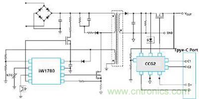 基于PD協(xié)議的充電器電路可以維持AC/DC部分不變,只是將QC協(xié)議控制器替換為PD控制器[1],比如Cypress半導體的CCG2(Type-C Controller Generation 2). CCG2 是最早通過USB-IF認證的PD控制器之一,內(nèi)部包含ARM® Cortex®-M0處理器和完備的PD協(xié)議收發(fā)器,可以滿足充電器,主機,附件,EMAC線纜等各種支持Type-C口的應用,在蘋果,聯(lián)想,HP,Dell,小米,樂視等一線品牌客戶都有眾多的量產(chǎn)案例。